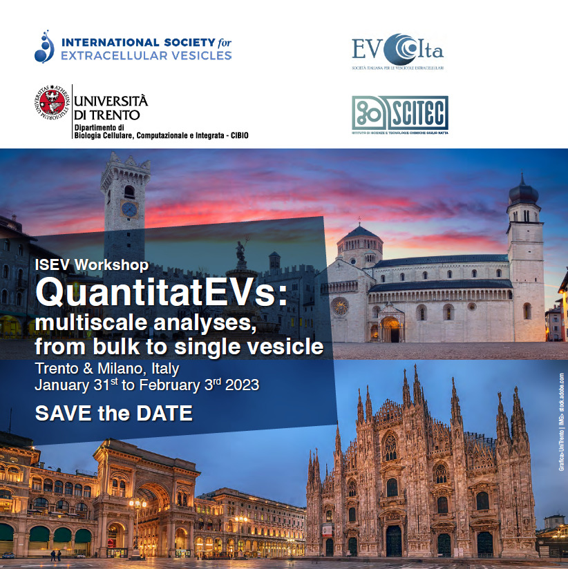 The 'QuantitatEVs' workshop aims to discuss quantitative strategies and harmonized wet and computational approaches towards the comprehensive analysis of EVs. Ranging from bulk to single vesicle analyses and with a focus on emerging technologies, our workshop will cover the quantitative analysis of different EV-associated molecular components and relevant EV biophysical features which are the core of EV-associated biomarkers discovery and validation for their clinical translation. The workshop will be held in Trento (Italy) from January 31 to February 2, 2023. The Workshop will be in-person only.