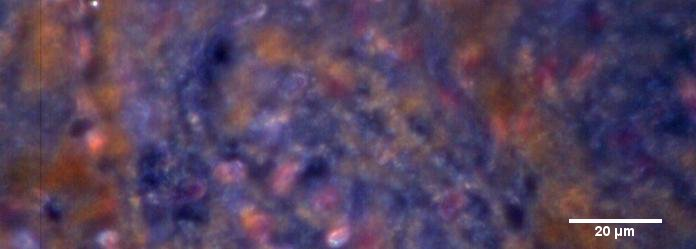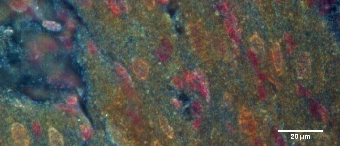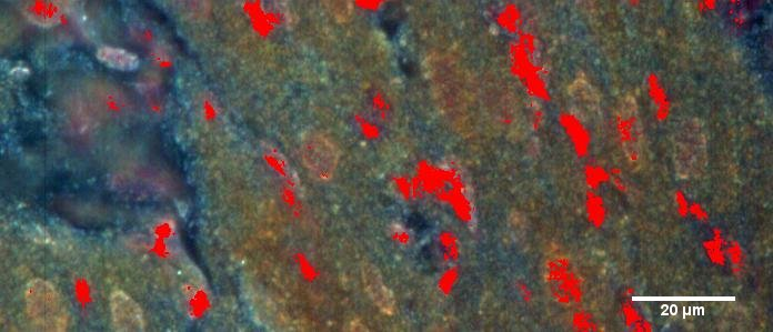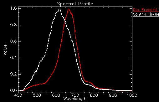 Figure one above illustrates an enhanced darkfield hyperspectral image of ex-vivo stained heart tissue from a negative control animal. Figure 2 shows an identical area of heart tissue from an animal exposed to doxorubicin. These images were each captured by the CytoViva system in 1-2 minutes. From a qualitative visual perspective, there is very little difference to be discerned between these two samples. However, because these are hyperspectral images, each pixel in the image contains the optical-spectral response from 400nm - 1,000nm. By comparing the spectral response of the pixels in the control tissue versus the exposed tissue (using hyperspectral image analysis software), it is possible to identify distinct tissue/pixel areas which contain a spectrum unique to the exposure of the doxorubicin drug. This spectral difference between exposed and non-exposed tissue is illustrated in figure 3 above, showing a 50nm peak wavelength difference in the doxorubicin exposed areas. As the system produces approximately 2nm of spectral resolution in each pixel across the entire spectral range, this 50nm shift is very significant.