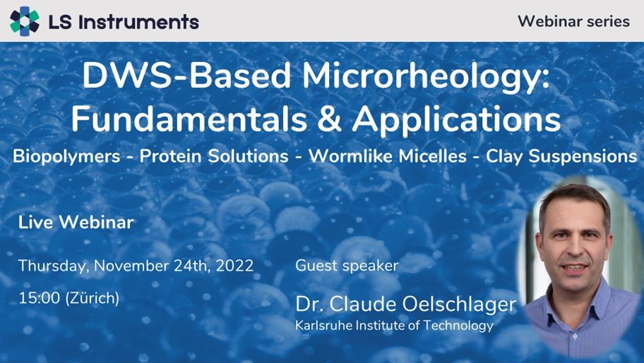 LS Instruments next webinar will take place on Thursday, November 24th at 15:00 (Zürich): Dr. Claude Oelschlager (Karlsruhe Institute of Technology) will be the guest speaker for this event. He will provide an introduction to DWS microrheology, and present direct applications to different systems such as biopolymers, proteins, and micelle solutions or clay suspensions.