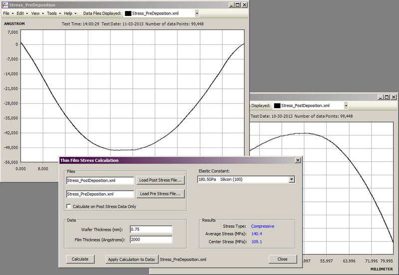 The Alpha-Step D-500 is capable of measuring stress induced during the manufacture of devices with multiple process layers, such as semiconductor or compound semiconductor devices. The bow of the sample is accurately measured using a stress chuck to support the sample in a neutral position. The change in shape from a process such as film deposition is then used to calculate the stress by applying Stoney’s equation.
