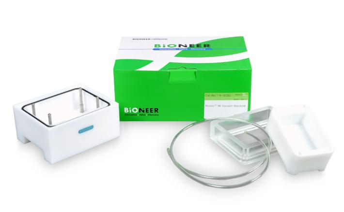 Biovac™ 96 Vacuum Manifold is an instrument that can extract DNA/RNA/genomic DNA from 96 samples in a short time. It can be used not only with Bioneer products, such as the 96-well plasmid extraction kit, PCR purification kit, and genomic DNA extraction kit, but also with 96-well extraction kits from other companies.