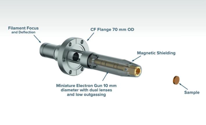 The EG10-XY model is a high-precision low-energy electron source, emitted from a thermionic cathode and focused by double focusing lenses. This model is designed for a wide energy range, from 5 eV to 3000 eV, with high coherence.
