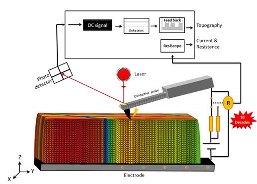 The measurement is made by applying a DC bias between the sample and a conductive AFM probe (tip at virtual ground). The tip is scanning in contact mode using the laser deflection for the AFM feedback . As an independent measurement, the ResiScope II measures the sample resistance through the High Performance Amplifier (HPA).