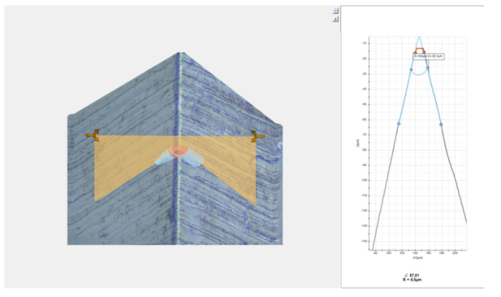Misurazione del volume semplice ed efficace. Grazie al software DeltaPix InSight, è possibile misurare facilmente i volumi nelle topografie 3D. L'area superficiale rilevante può essere selezionata tramite strumenti di selezione, consentendo l'estrazione precisa del volume. Inoltre, la misurazione del volume può essere regolata utilizzando due piani di taglio per delimitare e adattare il volume analizzato.