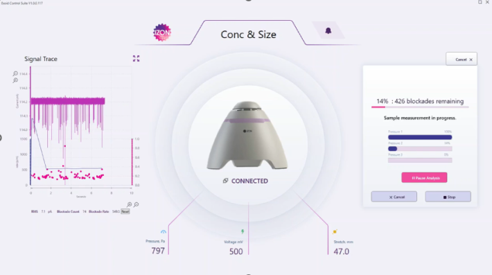 Dopo aver isolato le particelle con le colonne di isolamento qEV di Izon o con altre tecniche di isolamento, l'Exoid effettua l'analisi con una minima parte di campione senza che questo subisca alcuna preparazione, ma deve solo essere diluito in un elettrolita (PBS, HEPES, MES e KCI). Gli unici parametri da controllare sono pressione, voltaggio e stretch del nanoporo, il resto è automatizzato e controllato dal software, che guida l'utente durante il processo di analisi. Ogni campione viene misurato a 3 pressioni diverse ed è calibrato su delle biglie di calibrazione, permettendo di ottenere una misura precisa e standardizzata.