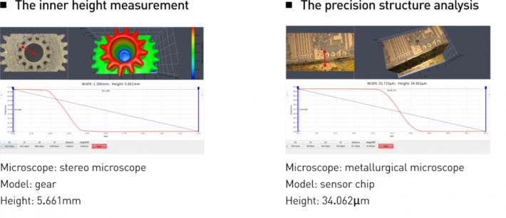 Basta un clic per creare un'immagine 3D, dopodiché il campione può essere osservato a colori reali o con pseudo-colore, e ruotato di 360°, misurato su qualsiasi posizione; i dati possono essere registrati in tempo reale. Con un microscopio metallografico con obiettivo a 10X , l'accuratezza della misurazione dell'asse Z e la ripetibilità sono ± 2 micron e ± 1 micron. Maggiore l'ingrandimento, maggiore la precisione.