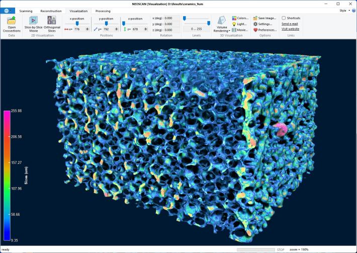 NeoScan N70 è uno scanner Micro-CT con un ottimo rapporto prestazioni/prezzo. I sistemi NeoScan microCT includono un software all-in-one sviluppato internamente, che permette il controllo intuitivo dello scanner e l'elaborazione dei dati. Dall'acquisizione di una serie completa di immagini di proiezione 2D, alla ricostruzione in un volume 3D, alla visualizzazione e all'ispezione di questo volume in 2D e 3D, il software comprende tutte le fasi complementari, dal campione ai risultati. Il pacchetto software Neoscan offre un'interfaccia utente intuitiva, che vi guiderà attraverso il vostro flusso di lavoro, consentendovi di utilizzarlo da subito. Tutti i risultati finali e intermedi sono memorizzati in formati di file convenzionali e possono essere importati in qualsiasi altro software.